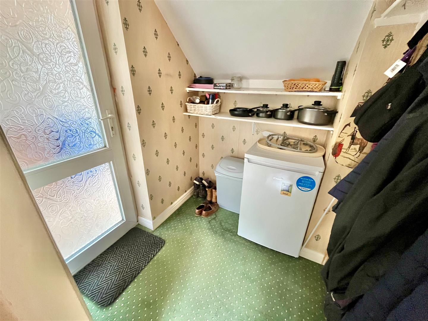 Fitted with a range of base and wall units. Work surfaces with single drainer sink unit. Window to the rear elevation and patio door to the garden. Wall mounted gas fired water heater. Access into: