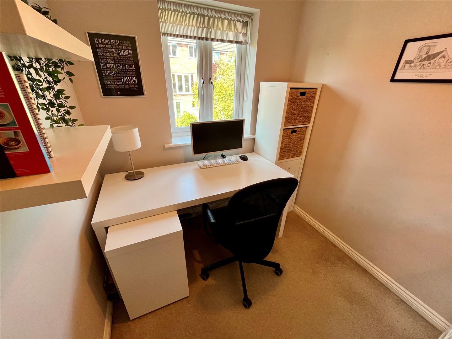 Fitted with a range of base and wall units. Work surfaces with sink unit. Part tiled walls. Appliances of electric oven with gas hob and hood over. Space for dishwasher, washing machine and fridge/freezer. Small breakfast bar. Window to the front elevation. Inset ceiling lights. Boiler cupboard with gas fired central heating boiler. Wooden effect flooring. Radiator.