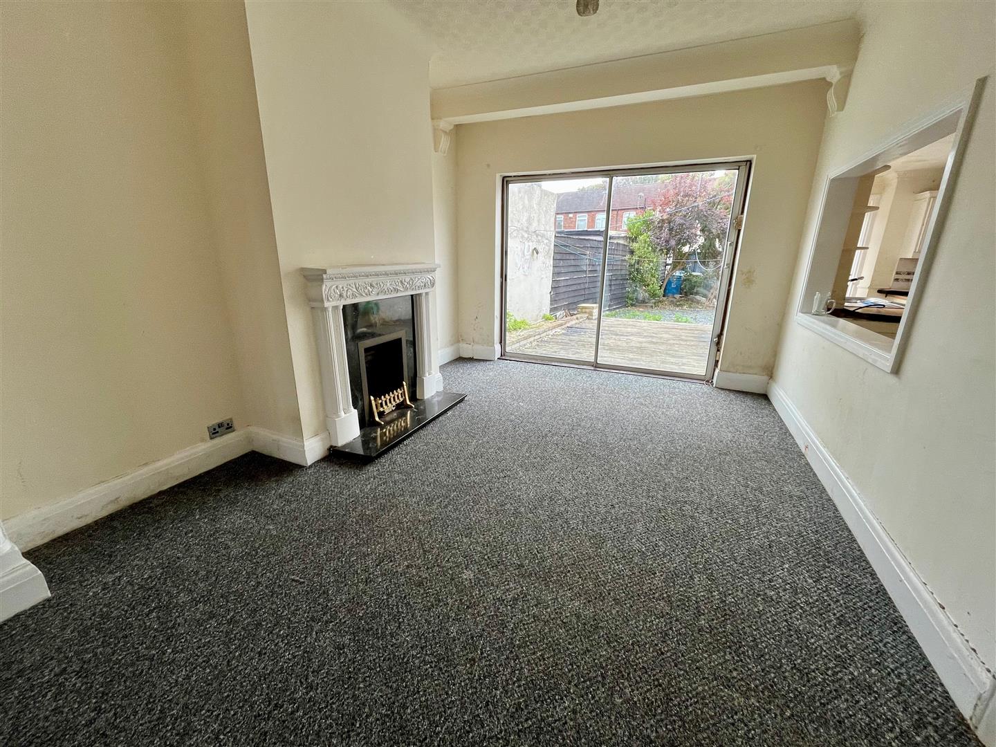 Patio door to the rear elevation. Fire surround. Radiator. Open hatch to the kitchen area.