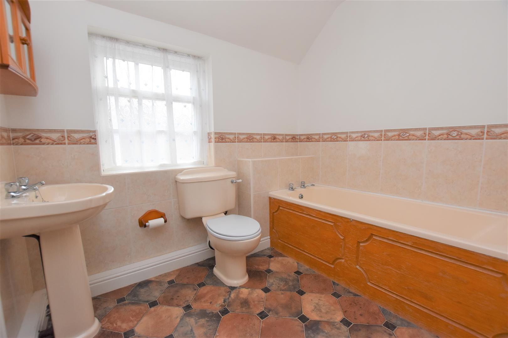 Double glazed window to the front. Comprising of a panel bath, pedestal wash hand basin and a low level flush WC. Laminate flooring. Tiled splash backs.