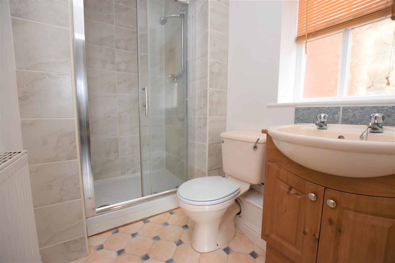 Double glazed window to the side. Comprising of a wash hand basin with cupboard beneath, shower enclosure with plumbed in shower and a low level flush WC. Single radiator. Tiled splash backs and an extractor.