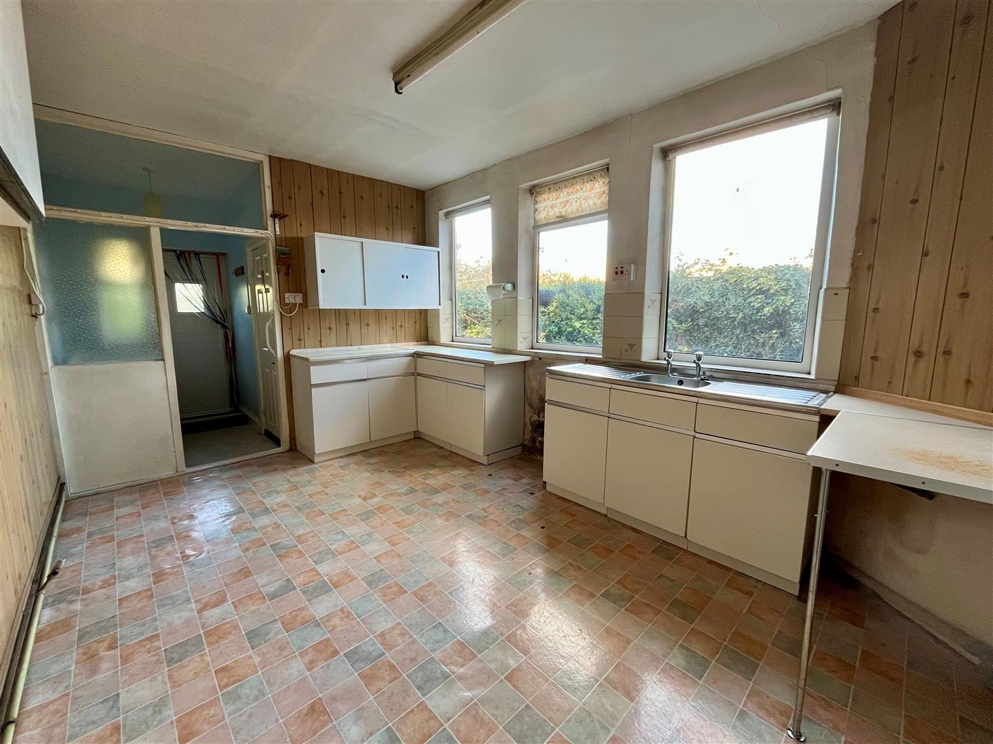 Containing a range of base and wall units, work surfaces with sink unit. Space for appliances. Windows to the side elevation.