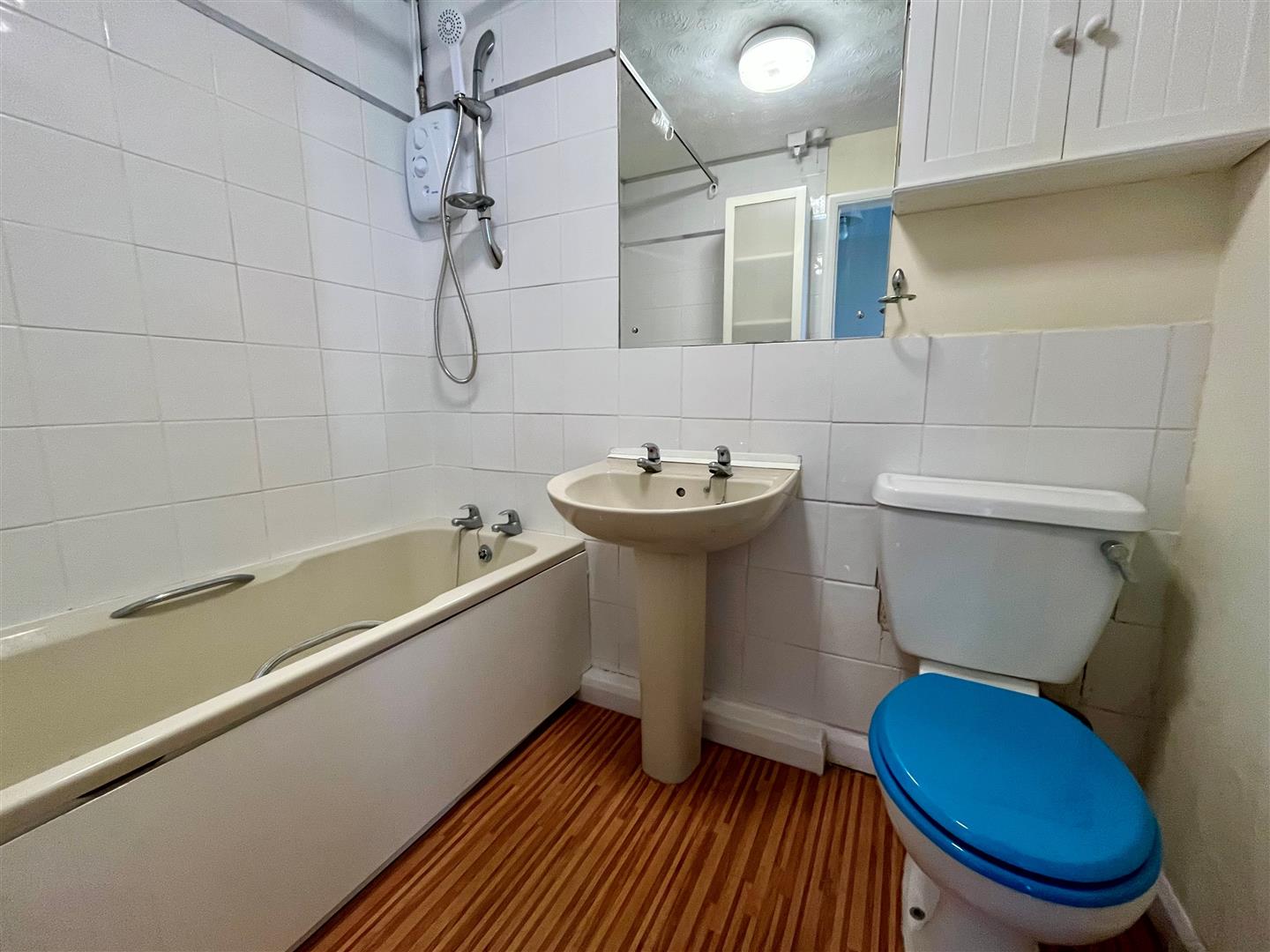 Suite of bath with electric shower over, wash hand basin and WC. Part tiled walls. Radiator.