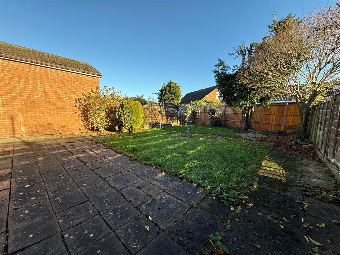 Surrounded partially by a low wall and hedge, with side access to the rear garden. Accessing the entrance porch via external door.