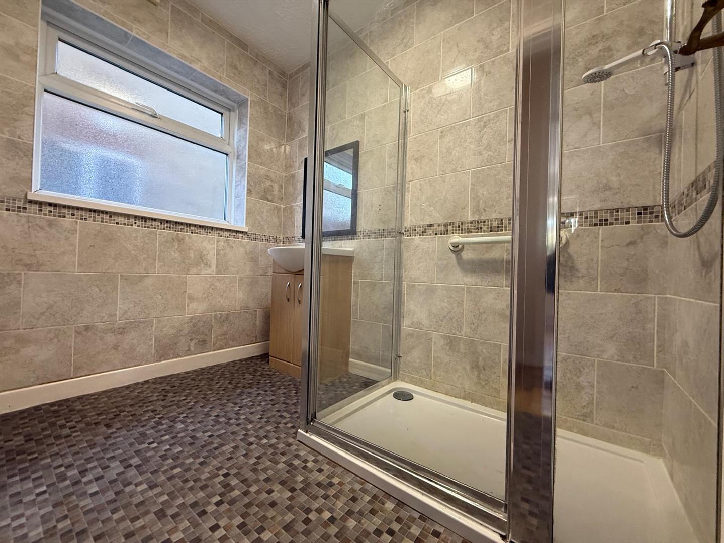 This tiled modern Shower Room has a large shower cubicle with over head shower, hand basin enclosed within vanity unit,
