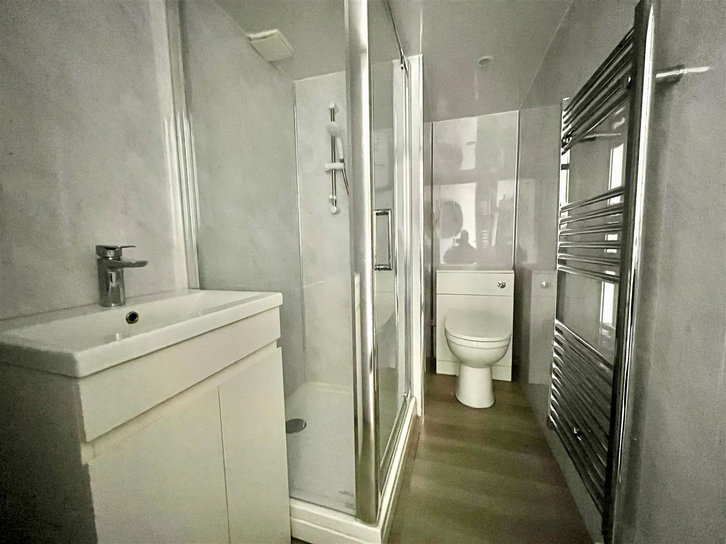 Suite of shower cubicle, wash hand basin and WC. Towel rail type radiator.