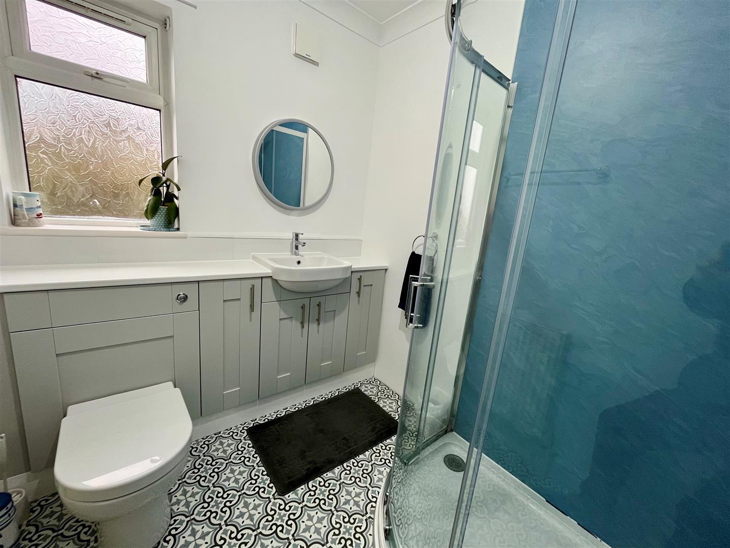 Suite of shower cubicle, wash hand basin and WC. Window to the rear elevation. Towel rail radiator.
