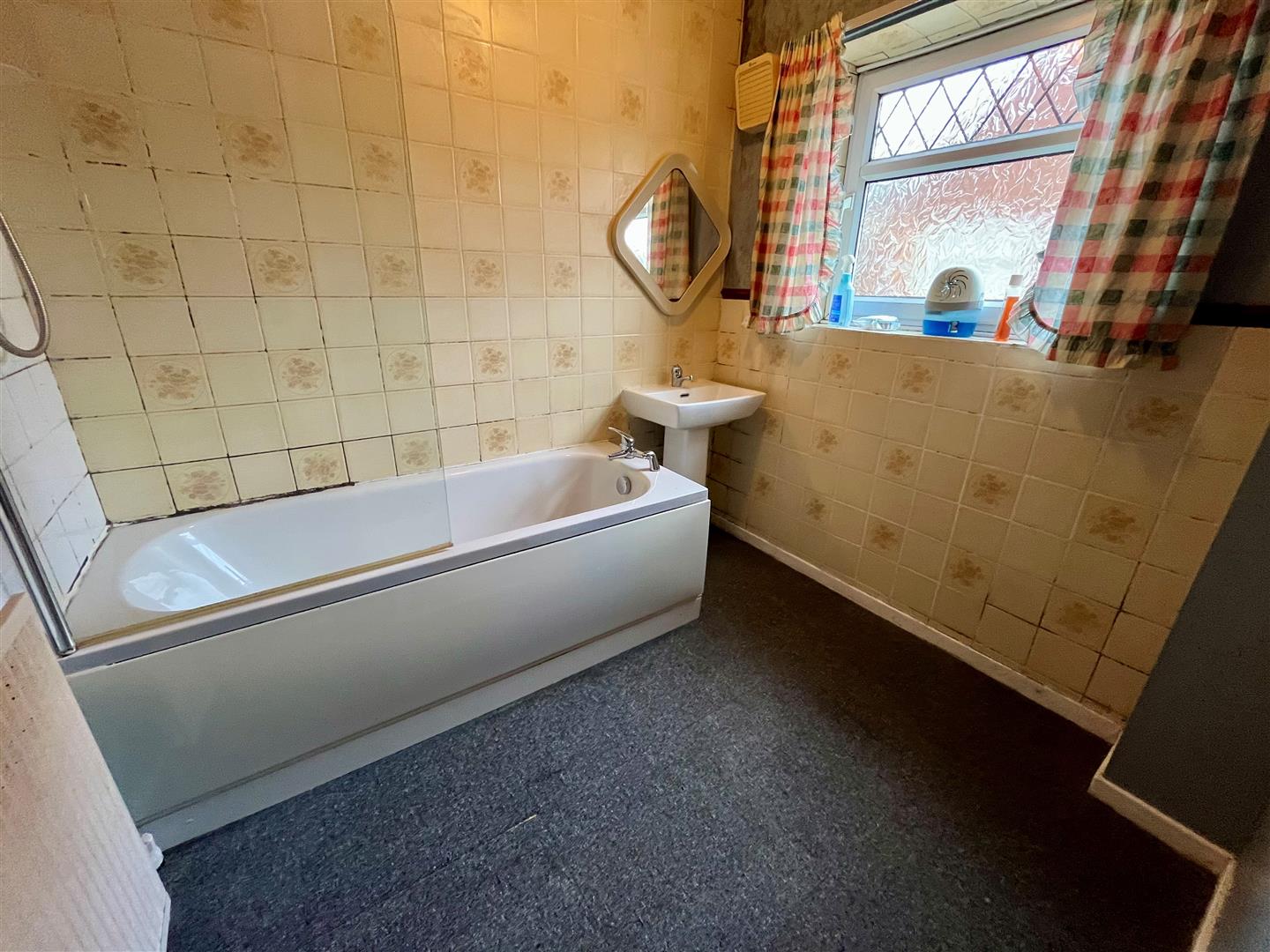 Suite of bath with shower over with screen. Wash hand basin. Window to the side elevation. Radiator.