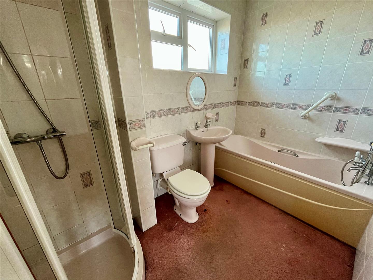 Suite of bath, basin, WC and shower cubicle. Window to the rear elevation. Radiator.