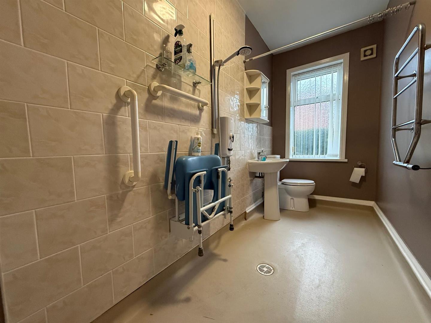 3.647m x 1.413m (11'11" x 4'7")Electric shower unit, wash hand basin and WC. Window to the side elevation, part tiled walls, extractor, radiator and towel rail heater.