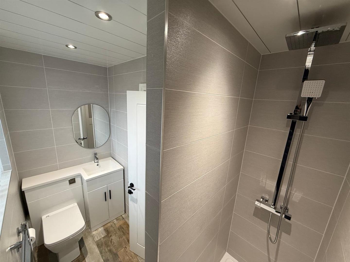A modern tiled Shower Room with an open multi head shower behind a tiled wall, w.c. and hand basin enclosed within a vanity unit, towel radiator and frosted window to the rear.