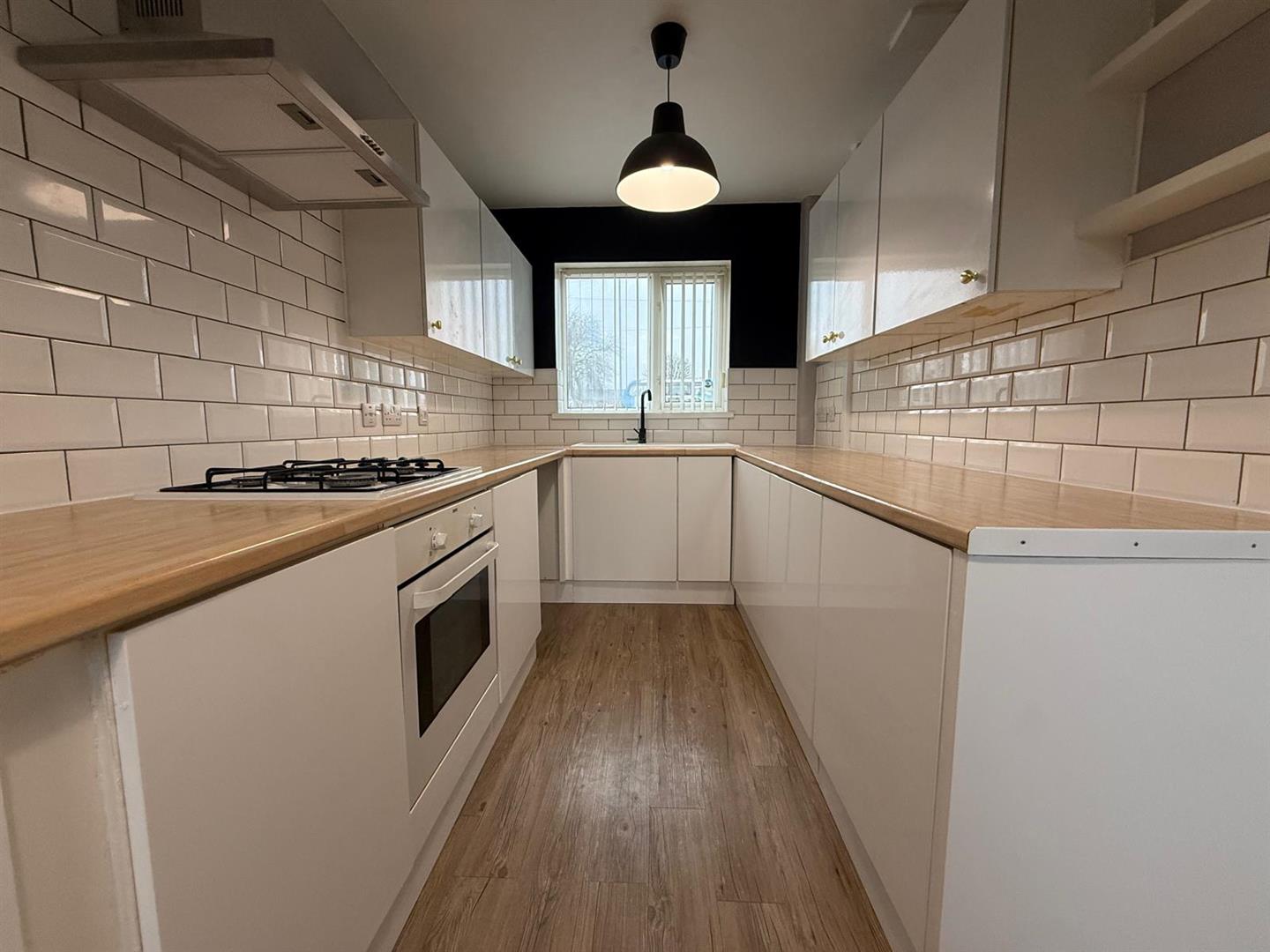 A modern fitted kitchen compromising of; mixture of wall and base units with a contrasting work surface, tiles to surround, integrated hob, oven and extraction hood, sink inset with mixer tap, space for a dining table, window to the front and external door to the rear. Radiator.