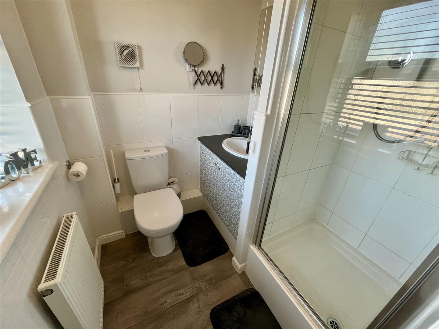Suite of shower cubicle, wash hand basin and WC. Window to the front elevation. Part tiled walls. Radiator.