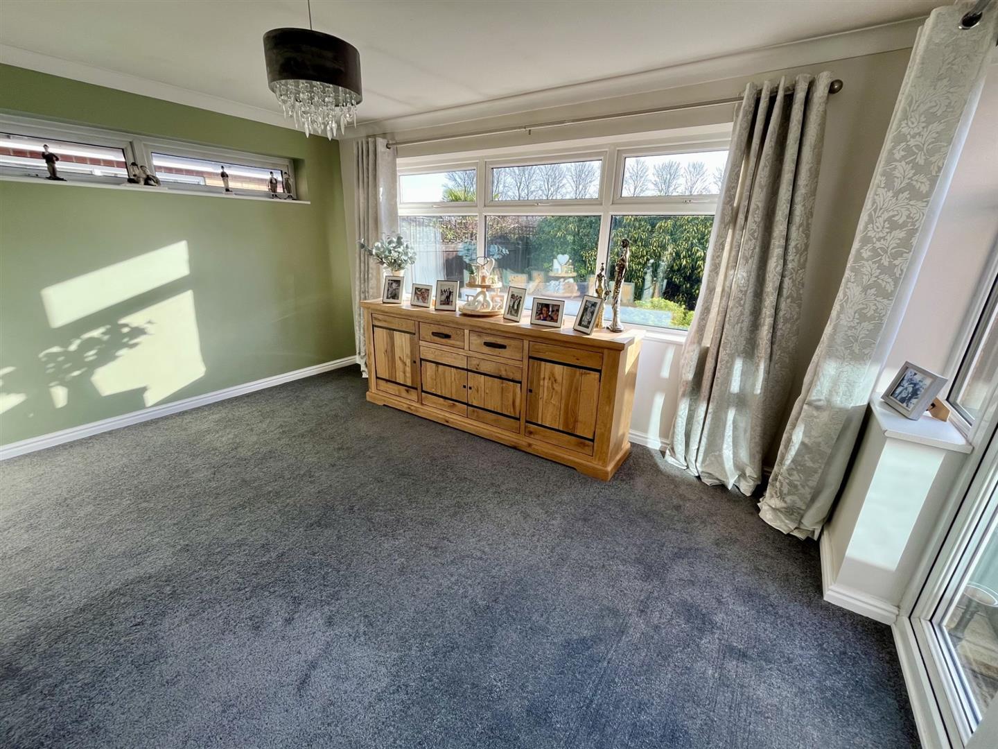 Fire surround with coal effect gas fire. Radiator with screen cover. Square arch leading into the extended area which has a window to the rear elevation and French doors to the side. Radiator.