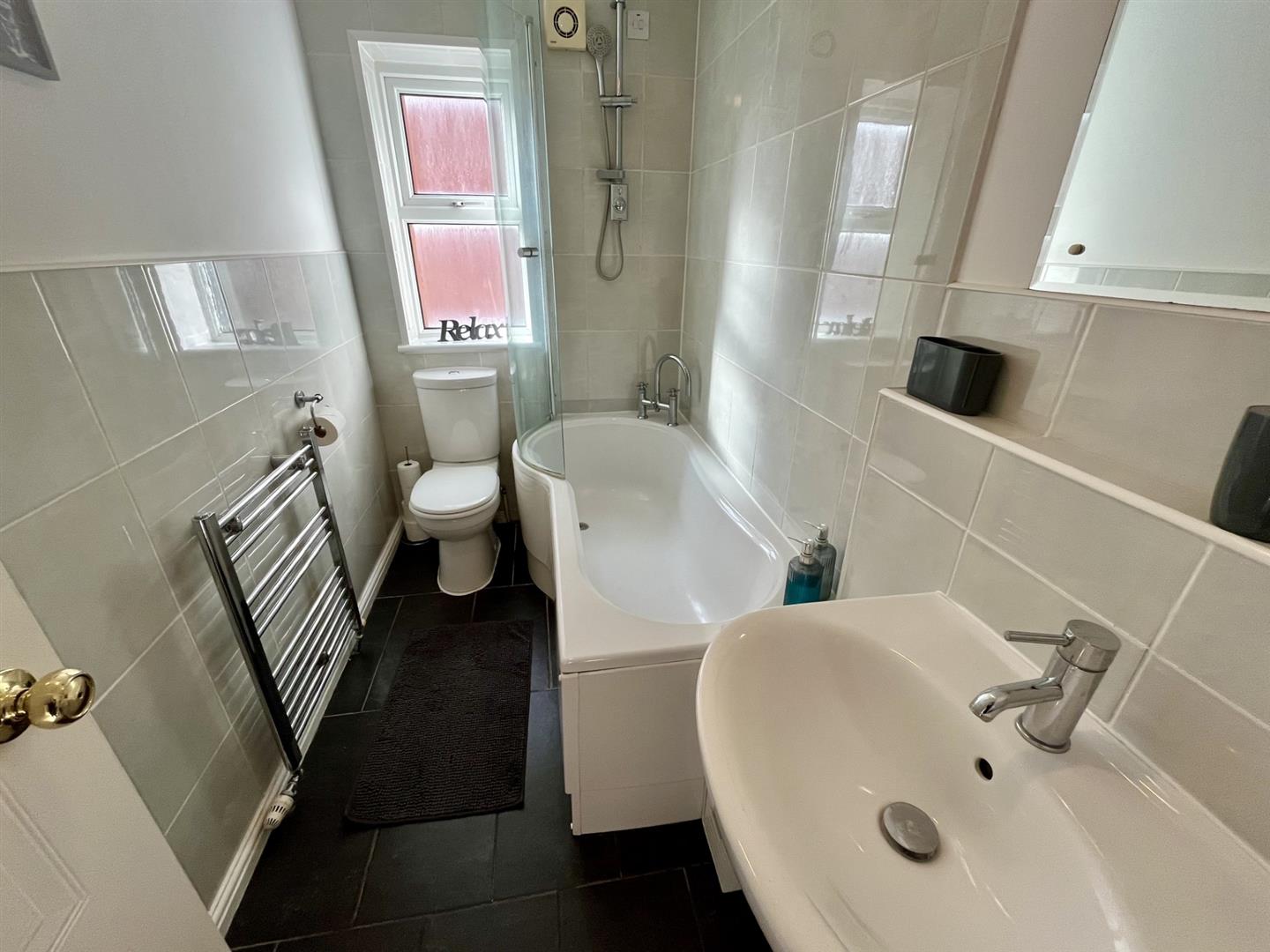 Suite of bath with shower over and screen. Wash hand basin. WC. Window to the side elevation. Part tiled walls, Towel rail type radiator.