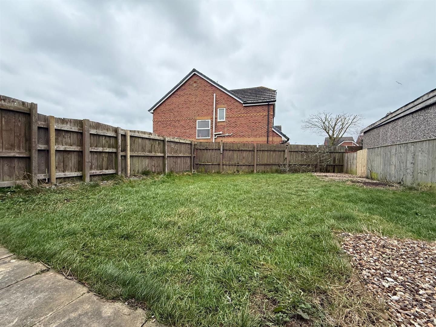 A generously sized south facing garden with timber fencing to surround, mostly laid to lawn with part paving, part gravel. Allowing access into the Kitchen via French doors and side access via gate to the side driveway.