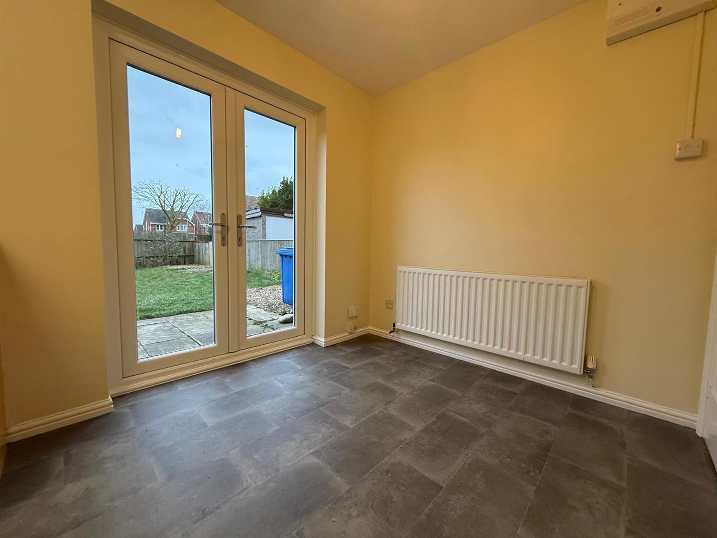 Another good sized living space, offering a combined Kitchen and Dining Space with French doors to the rear elevation. The Kitchen composing of; a range of wall and base units, sink inset with mixer tap, freestanding electric cooker and tiled splashbacks. To the other side of the room is a space which can house a dining table, also with a cupboard for storage, window to the rear and radiator.