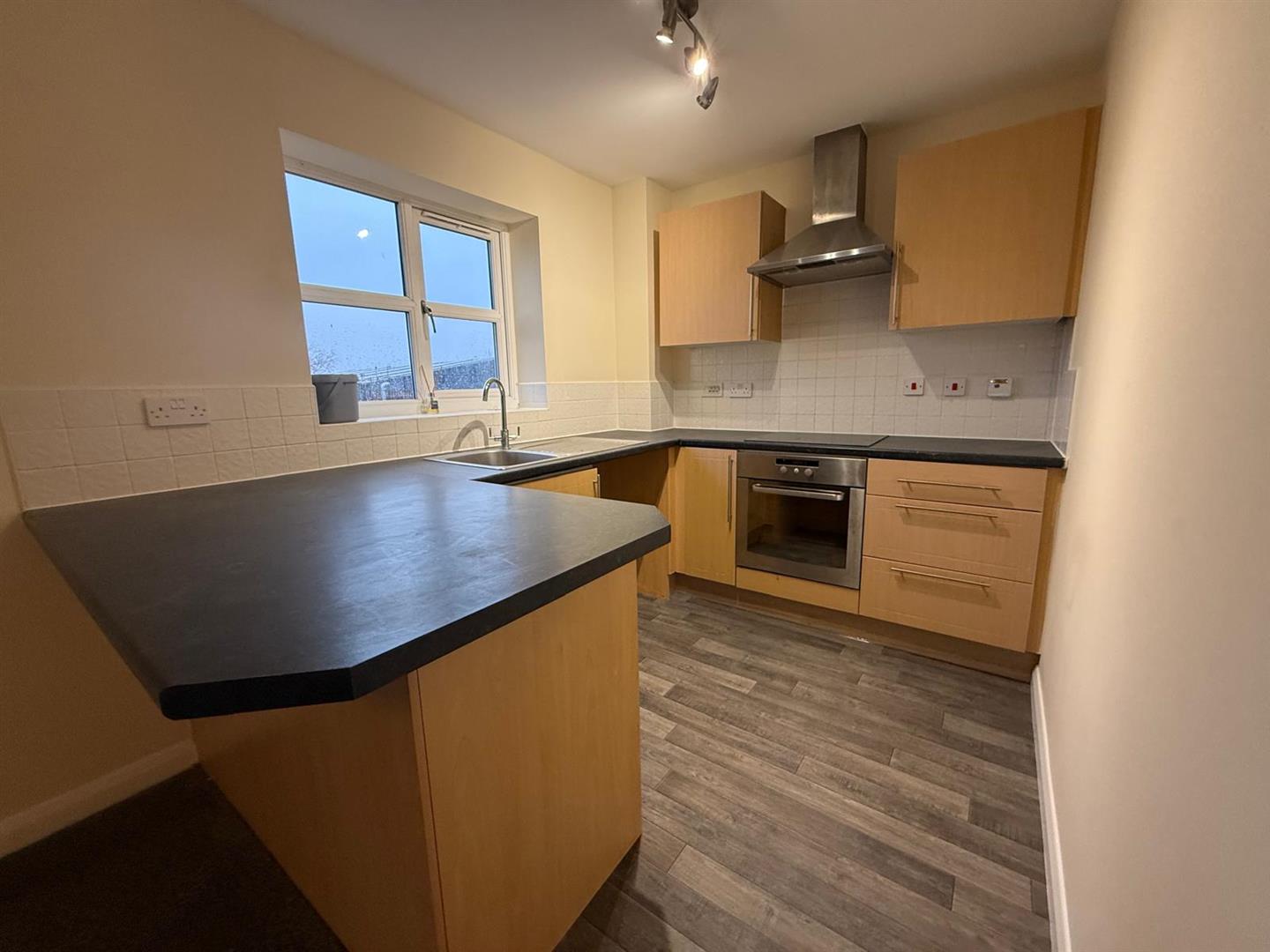 Fitted with base wall and drawer units, worktops and splashbacks, breakfast bar, stainless steel sink unit with mixer tap, integrated electric oven with extractor hood over. Window to the front elevation.