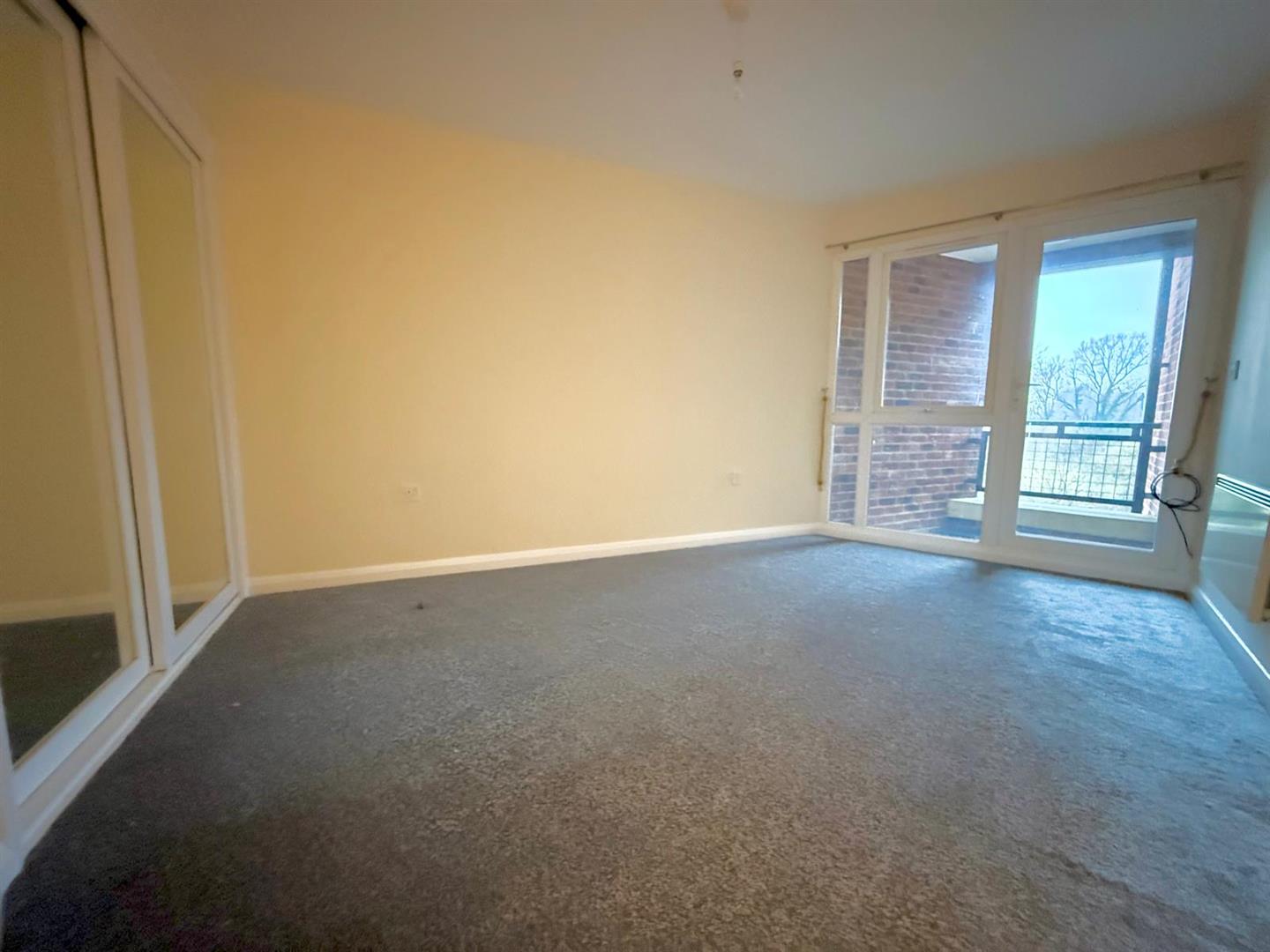 Fitted with mirror fronted wardrobe, glazed door opening to balcony, electric wall heater.
