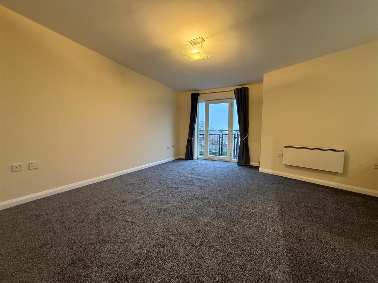 Two electric wall wall heaters, glazed doors to balcony. Open to kitchen.