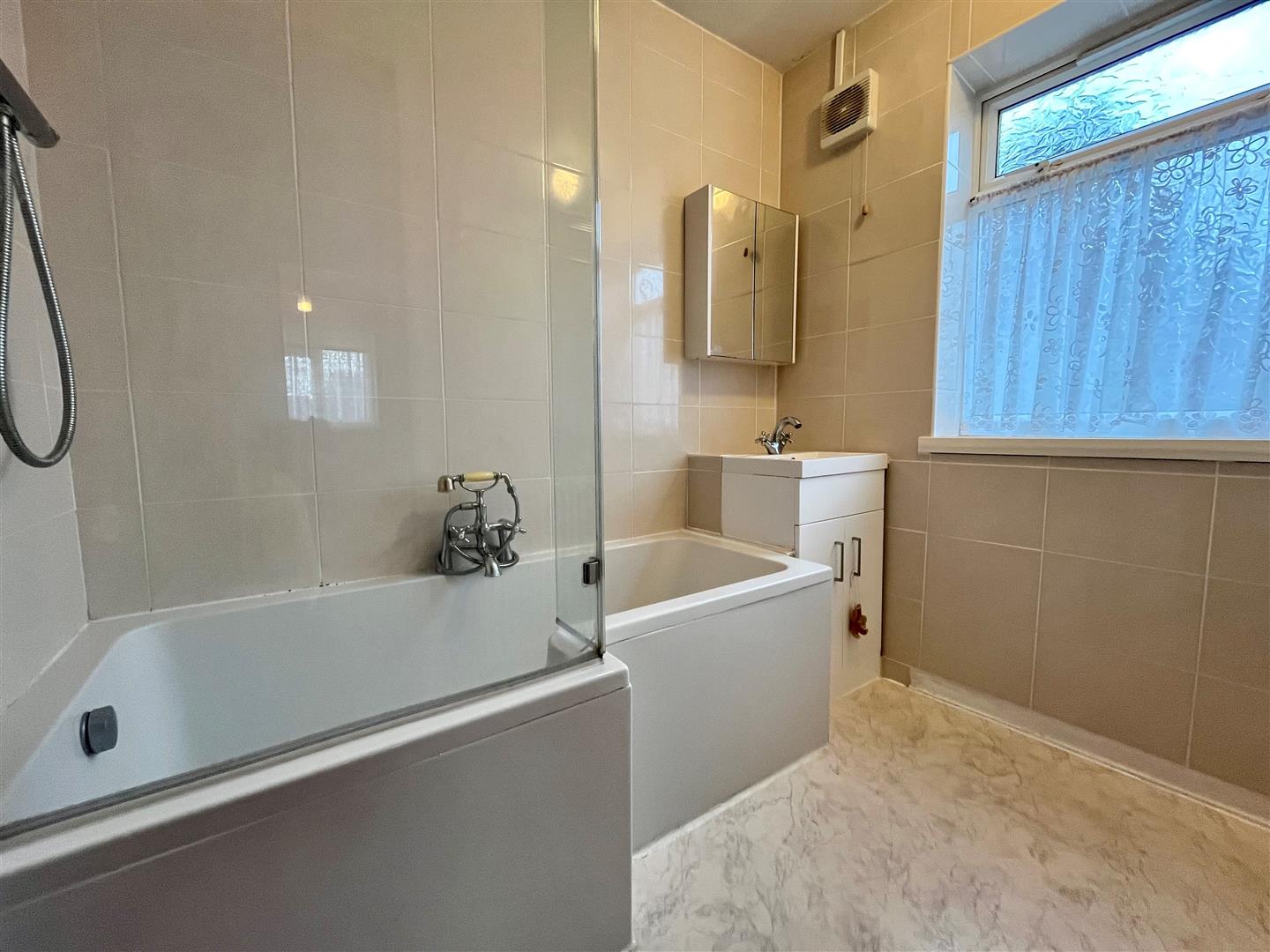 Suite of bath with mains shower attachment to the taps, shower over and screen. Vanity unit with basin. Store cupboard. Tiling to the walls. Extractor fan. Radiator.