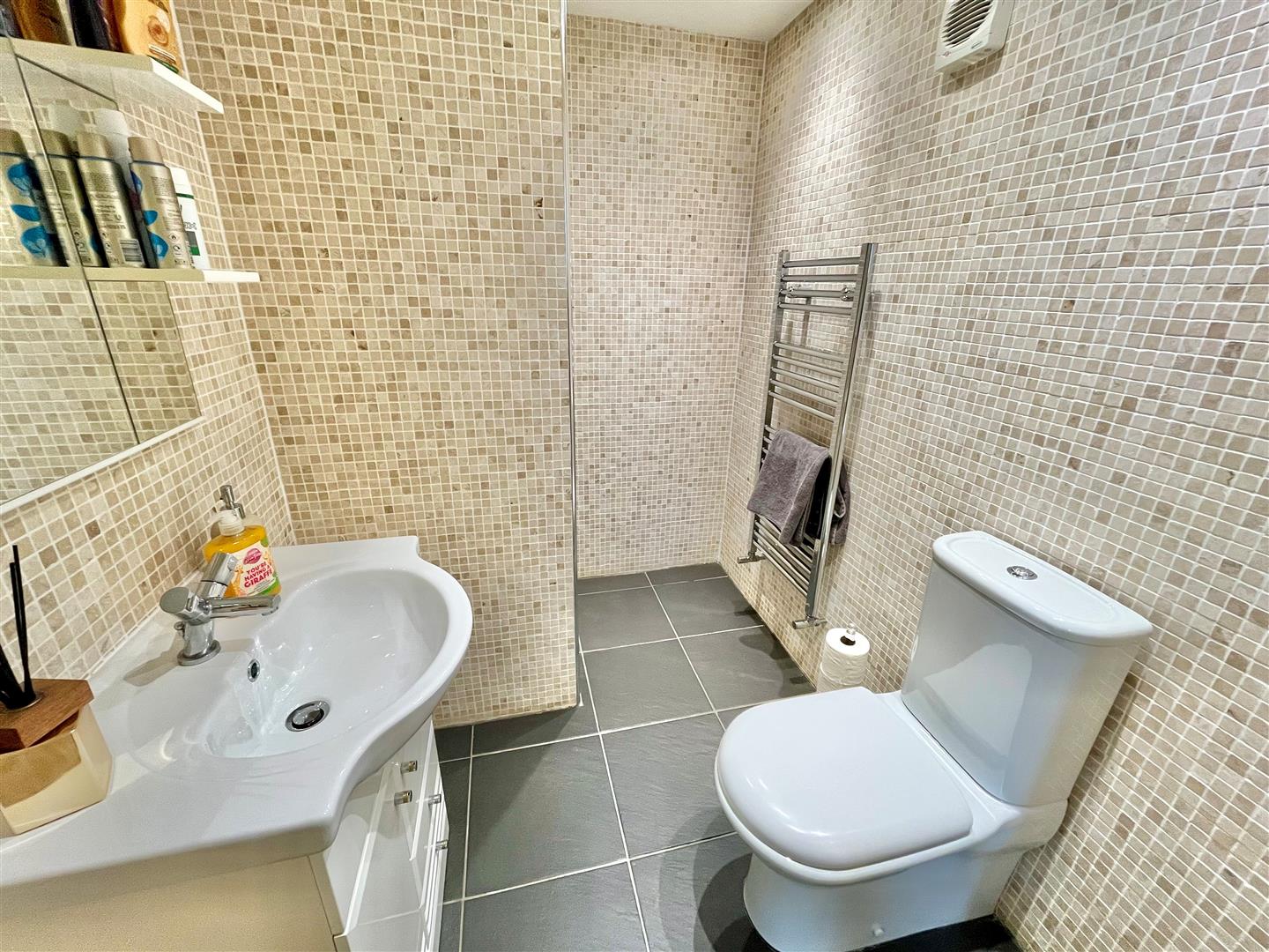 Suite of shower, wash hand basin with vanity cupboards and separate WC. Tiling to the walls and floor. Extractor fan. Towel rail radiator.