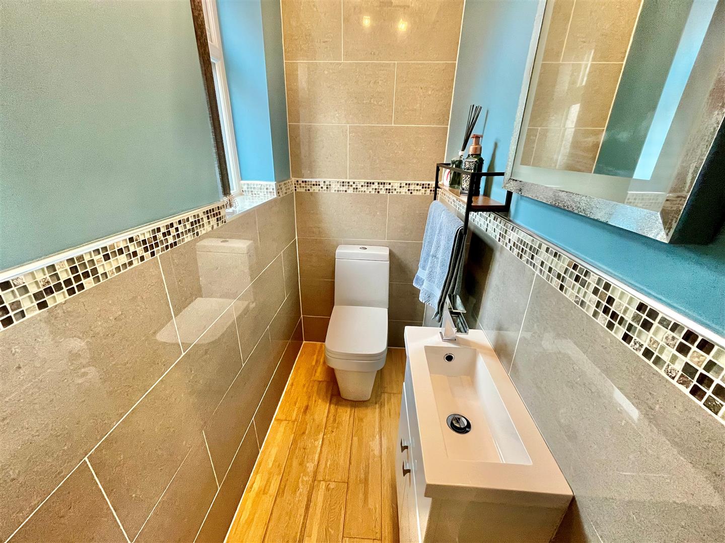 Suite of WC. Wash hand basin with vanity cupboard beneath. Part tiled walls. Wooden effect flooring. Window to the side elevation.