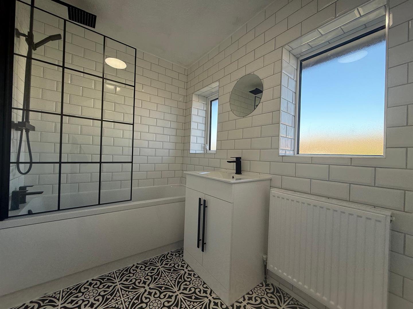 Newly fitted modern partially tiled bathroom consisting of; bathtub with overhead shower, shower screen, hand basin enclosed within vanity unit, W.C., three frosted windows to the rear and radiator.