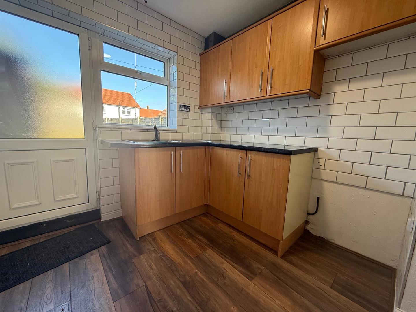 The kitchen consists of; a range of wall and base units with contrasting work surface, tiled splashback, sink inset with mixer tap, storage under-stairs cupboard, window and door to the rear external. Radiator.