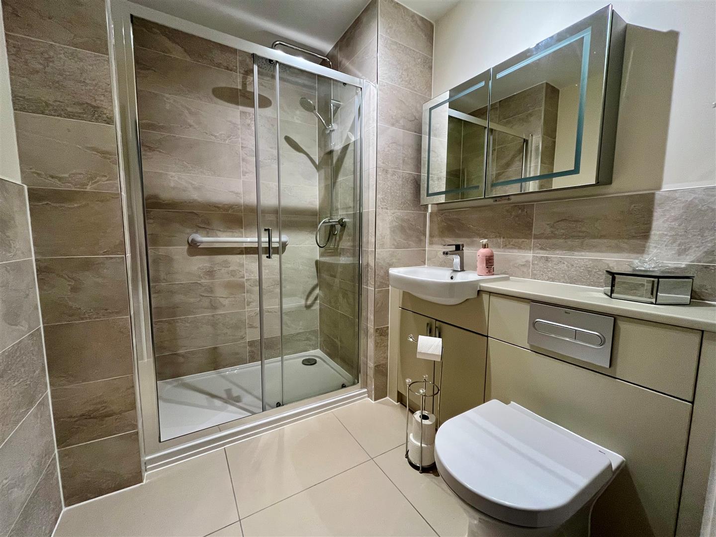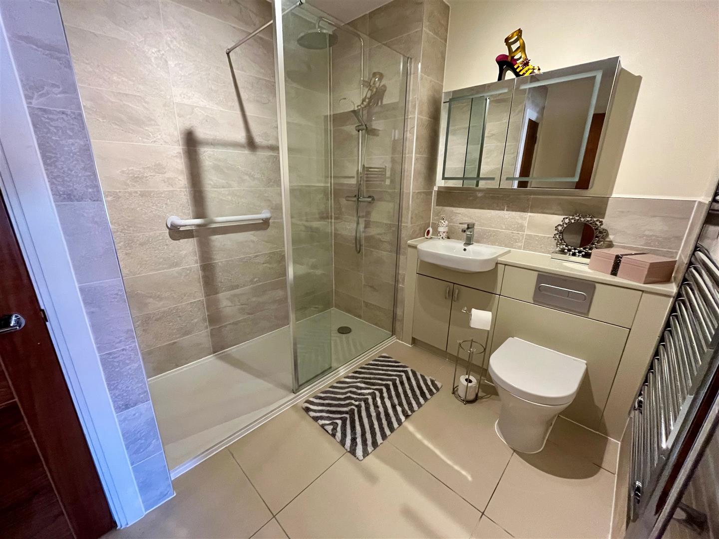 Shower cubicle with mains plumbed shower. Vanity unit with wash hand basin. WC. Towel rail radiator. Part tiled walls. Dimplex electric fan heater. Tiled flooring. Linen cupboard.