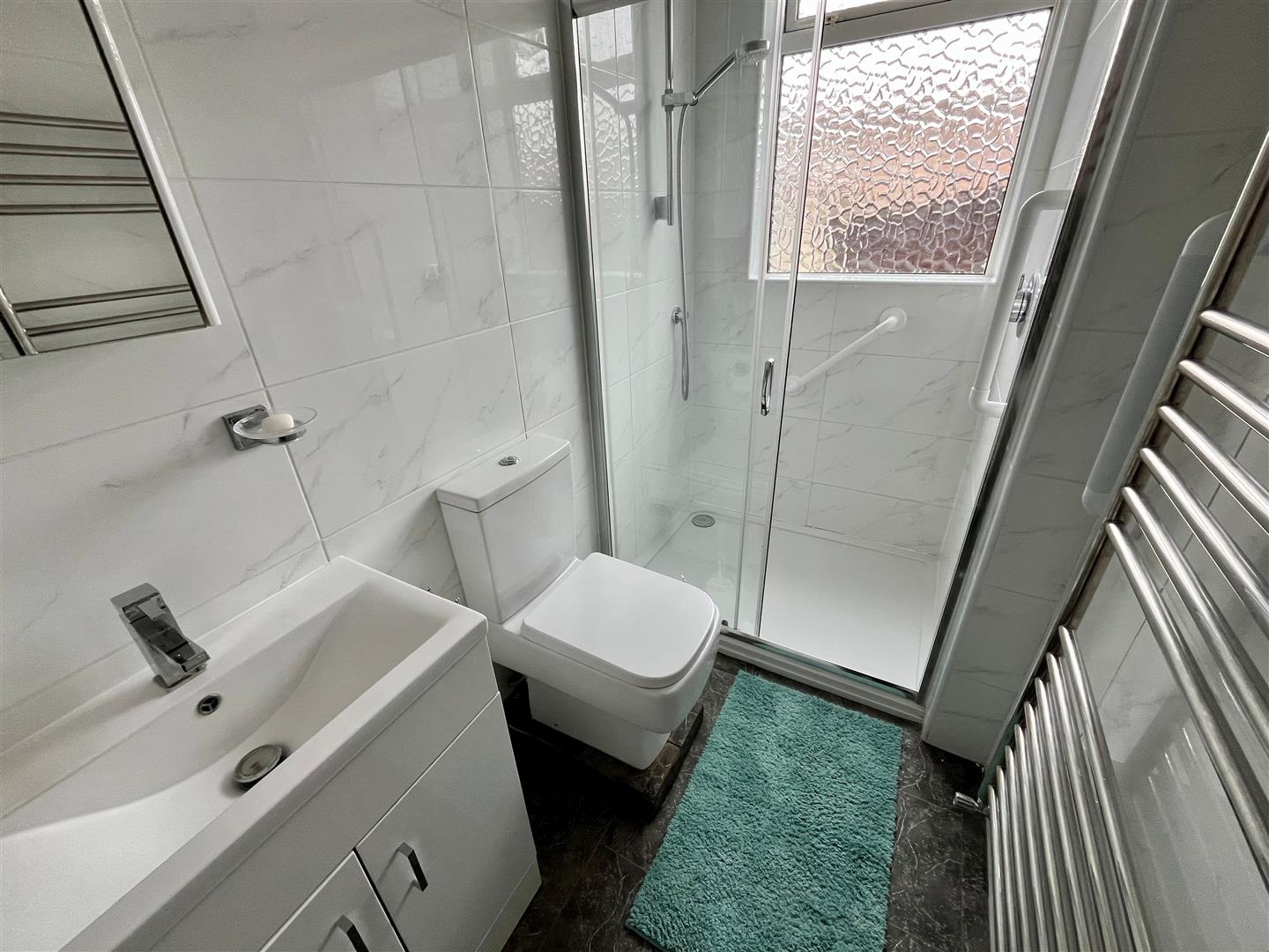Suite of shower cubicle. Vanity unit with wash hand basin. Separate WC. Tiling to the walls. Towel rail type radiator. Extractor fan. Window to the rear elevation.