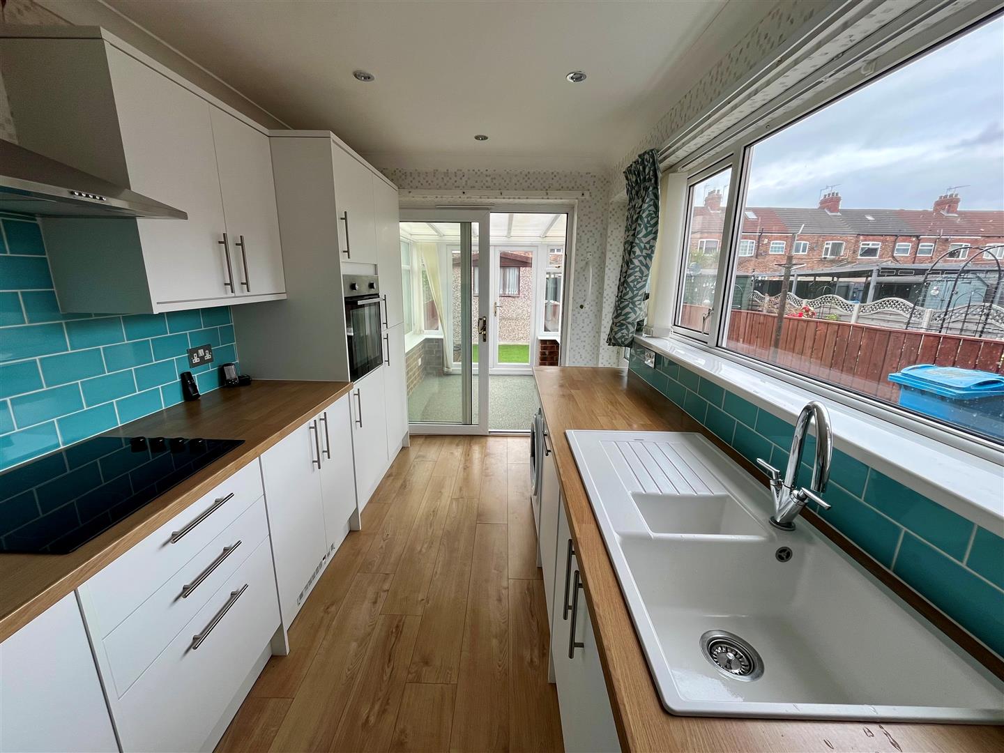 Fitted with a range of base and wall units. Work surfaces with single drainer sink unit. Appliances of electric oven and hob, dishwasher, fridge and freezer. Space for washing machine. Window to the side elevation with adjoining side entrance door. Wooden effect flooring. Part tiled walls. Sliding door provides access into: