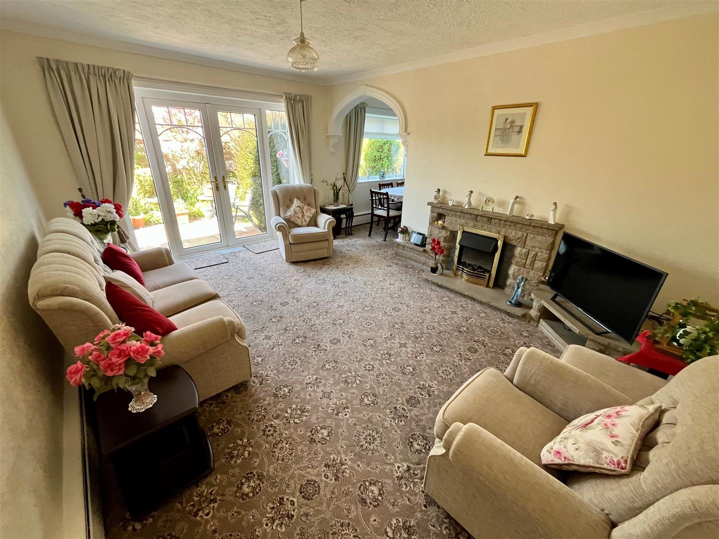 Feature fire surround with coal effect electric fire. French doors to the rear garden area. Skirting radiator. Open plan access into:
