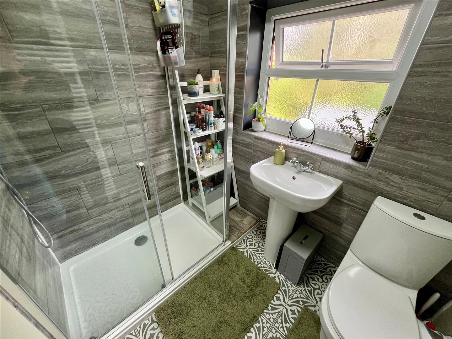 Suite of shower cubicle with main shower. Wash hand basin. WC. Towel rail radiator. Extractor fan. Part tiled walls. Window to the rear elevation.