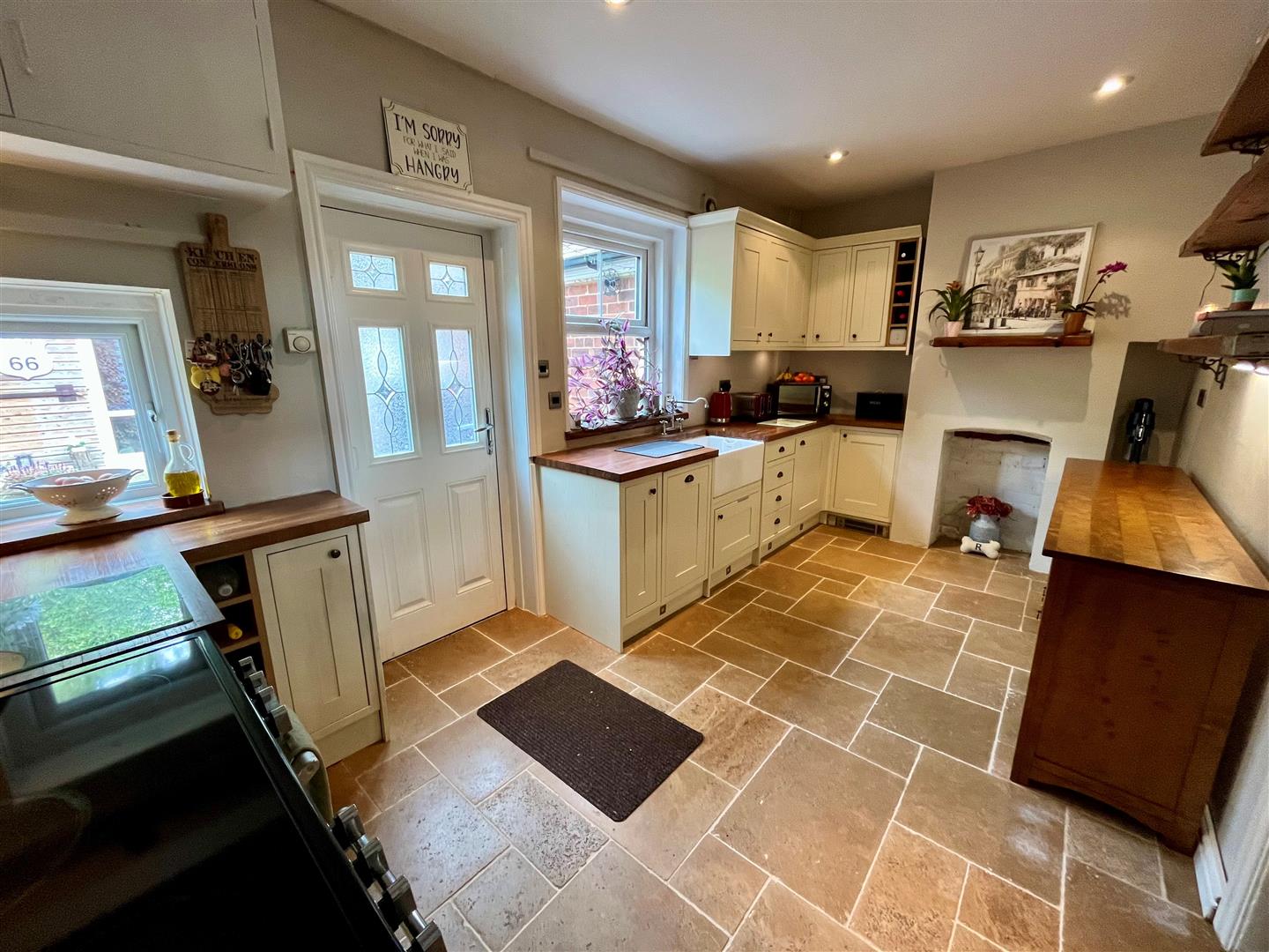 Fitted with a range of base and wall units. Contrasting work surfaces with deep glazed style sink unit. Cookermaster Leisure range style electric cooker with hood over. Two windows to the rear elevation with rear entrance door. Two floor level heaters. Tiled flooring.
